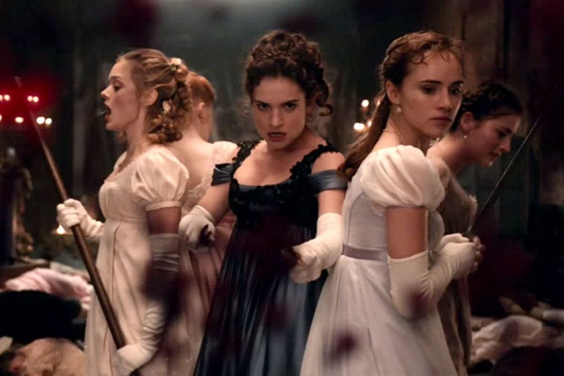 Messen steken ze kunstig tussen hun kousenbanden, geweren dragen ze als sjerpen om hun schouders. Deze elegante krijgerslook leidt niet tot bloedmooie gevechten, Lizzy (Lily James) en haar zusters houden het bij tot simpele vechtersmoves met getuite lippen.