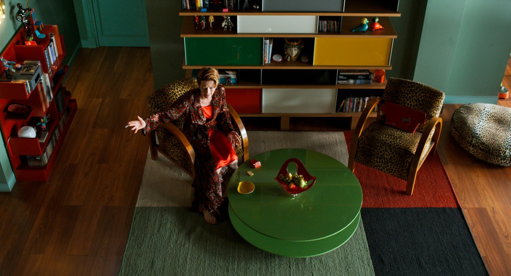 De eerste keer dat de telefoon gaat, mist ze de oproep. Daarna plugt ze haar oortjes in (hier geen vintage telefoonhoorn) en start Het Exit Gesprek. Tilda Swinton (We Need to Talk About Kevin, Suspiria) is een actrice die zo’n monoloog overtuigend uitspeelt: met haar krachtige stem, expressie en onverbiddelijke blik is ze een getroffen vrouw in optima forma. Van het moment dat ze haar net gekochte gereedschap in haar designertas stopt tot en met het explosieve einde.